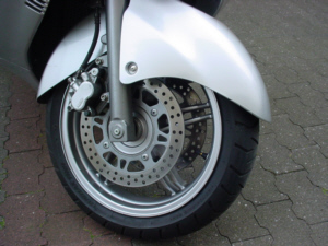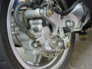 | Vorderrad mit Doppelscheibenbremsen in 260 mm. | Das Hinterrad mit der selbstnachstellenden Handbremse. |