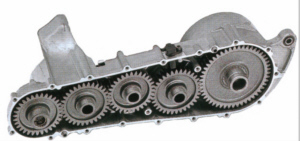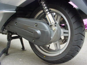 | Die Aluminiumschwinge mit der 160/60 R 14 Bereifung. | Statt Kette oder Zahnriemen, Zahnräder im Ölbad. |